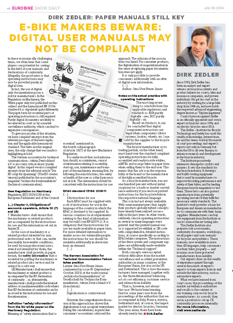 Der Fahrradhersteller bzw. dessen Handelspartner muss hingegen die normkonforme Betriebsanleitung für komplette und fahrbereite Pedelecs, E-MTBs und E-Cargobikes beim Verkauf an den Endverbraucher in Papierform aushändigen. Das heißt, diese Aufgabe obliegt der Marke bzw. dem Komplettradhersteller.